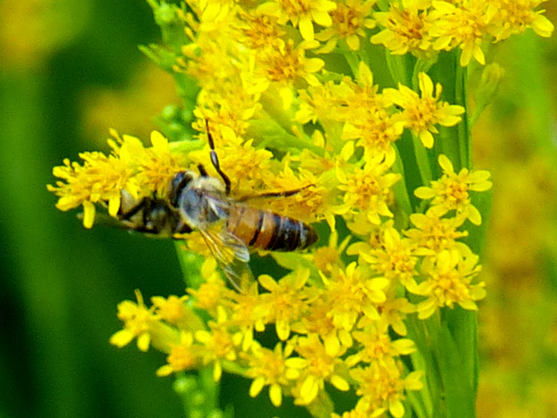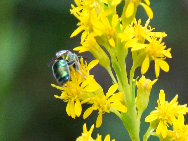 Plant goldenrod for its golden beauty and for pollinators like the gorgeous green orchid bee (Euglossa sp.) shown below …