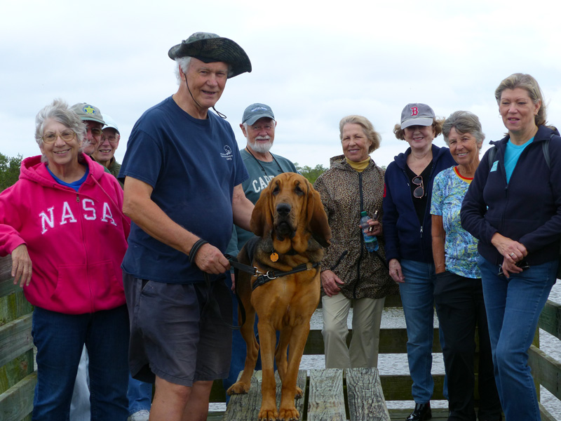 Despite dismal weather and some sputters of rain that caused a few folks to turn back, a group of us made it to the Oslo Riverfront Conservation Area (ORCA) Observation Tower on 1-1-2018. Gorgeous Gwen poses center in the midst of Diane Morgan, Don Schuster, Karen Schuster, Ralph Johansen, Edel Livermore, Liz True, Dorene McLeod, and Gayle Lafferty.