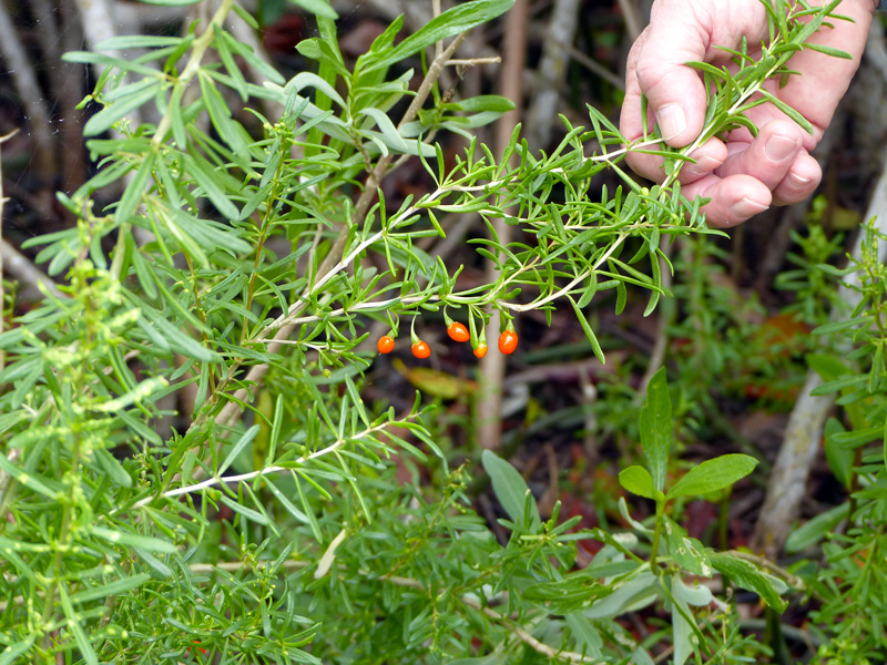 Our goal was to find Christmasberry (Lycium carolinianum) for Edel, and we found fruits on a number of plants, as shown below stabilized for a photo by Ralph …