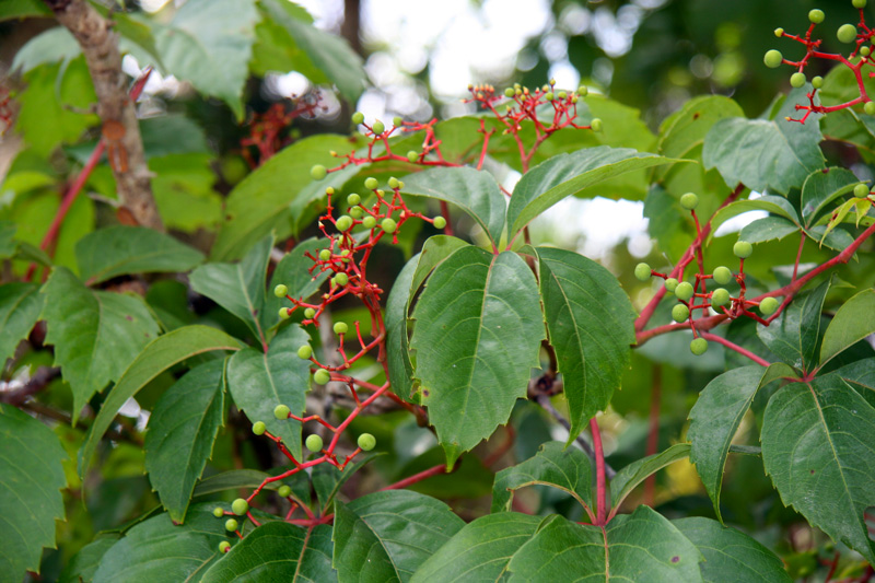 Virginia creeper (Parthenocissus quinquefolia) is native vine that folks either love or hate. Though it leaves are held in groups of 5, as its species name quinquefolia indicates (think quintuplets), this vine sometimes gets confused with poison ivy (Toxicodendron radicans) when a person “sees” only 3 leaves. 3 Leaves: Let it Be is an adage that many us were taught as children since poison ivy holds its leaves in groups of 3.