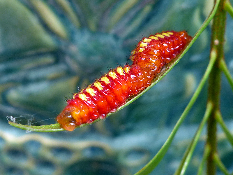 Eggs are laid on tender new coontie growth, tender enough for the tiny, tiny flesh-colored caterpillars to consume. Cycasin, a toxic substance is heavily concentrated in the new foliage, and the larvae become toxic and more conspicuous.
