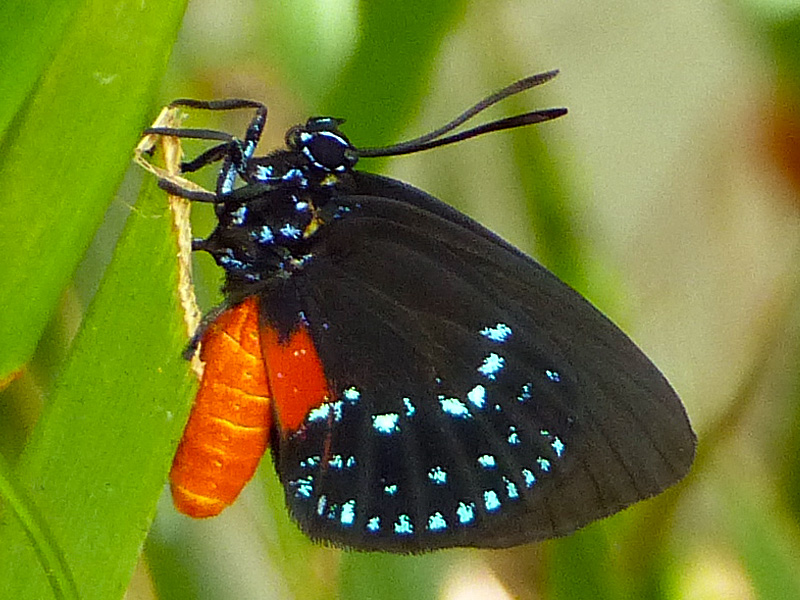 Atala butterflies are small black butterflies with 3 rows of aquamarine spots on their hindwings. This striking color also rings their eyes. These markings vary slightly on each butterfly and are thought to aid in mate recognition. Atala butterflies live 3 weeks or longer in the wild and mate multiple times.
