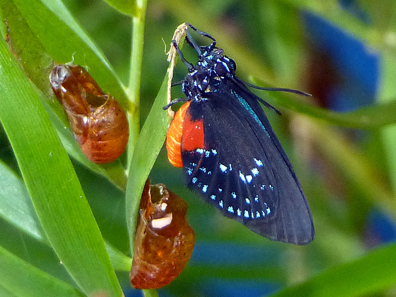 They often pupate together right on the coontie. The butterfly below just emerged from its pupal case and is drying its wings.