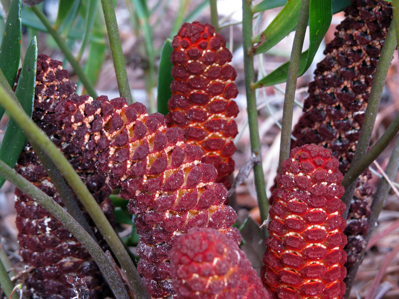 Coonties are dioecious. Males have long thin cones (shown below), and female plants bear shorter and wider cones. Specialist beetles transport the pollen from the male cones to the female cones.