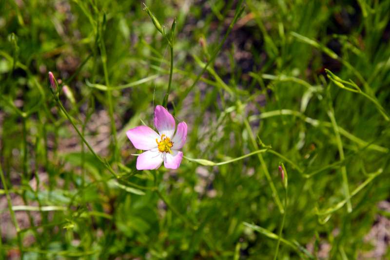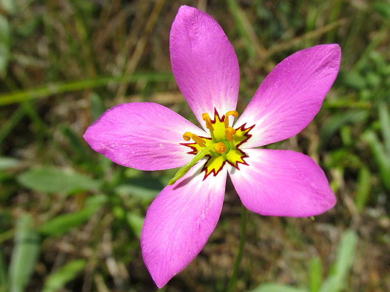 Its genus name, Sabatia, honors Liberatus Sabbati, an 18th century Italian botanist. Its species name, stellaris, means star and refers to the dramatic and jagged maroon star outlined in the center of this flower’s five pink petals. Note the green ovary, the long green stigma, and five pollen-laden yellow stamens.