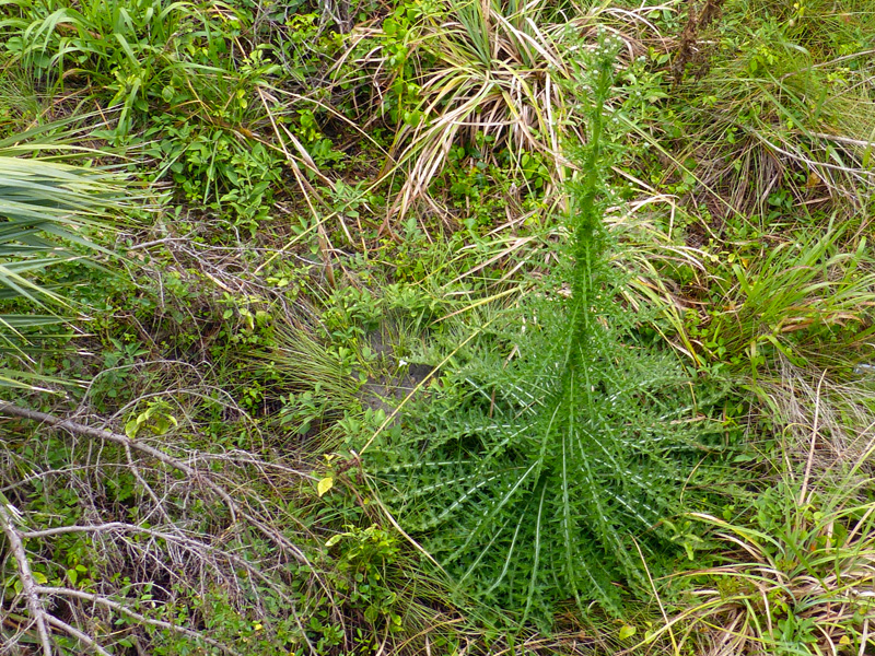 Looking down from the Viewing Platform at Pelican Island National Wildlife on March 11, we saw a striking and substantially sized specimen of spiny sowthistle (Sonchus asper), an elongate pyramid thriving in the rich marshy soil. Spiny sowthistle can grow up to be 6 feet tall in fertile conditions.