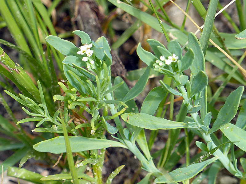 Seaside (or salt) heliotrope (Heliotropium curassavicum) was flowering at PINWR. This low-growing succulent has very fleshy greyish blue-green foliage and tiny white flowers with yellow throats arranged in scorpiod cymes (flower cluster with a central stem).