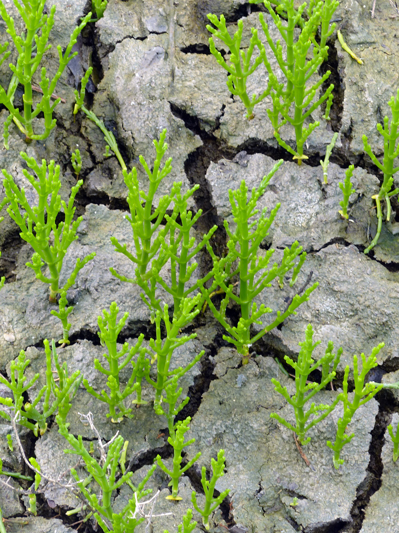 Pictured above are saltwort, the more chartreuse, bushy plant, and two species of glasswort: Perennial glasswort (Salicornia ambigua) and annual glasswort (Salicornia bieglovii). Also called Virginia glasswort, perennial glasswort likely shown in the upper left of the photo is less branched and more erect. Annual saltwort, also known as dwarf saltwort has a much more branched appearance …