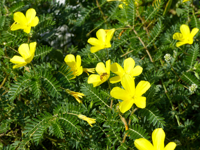 Its bright yellow, five petaled flowers are about 2″ across, abundant, and eye-catching even at fast speeds. Its flowers are held on long pedicels (2-3″ flower stalks). We saw this plant along Highway A1A at the Captain Forster Hammock Preserve and at the Brevard Barrier Island Sanctuary and Education Center. Native to east Africa, It thrives in dry, disturbed sandy soil in warm climates including Texas, Louisiana, Georgia, and Florida.