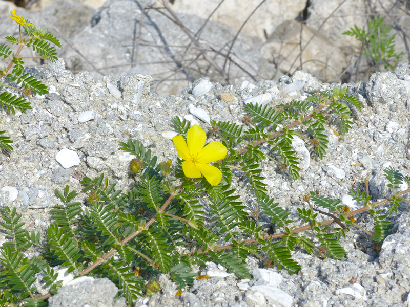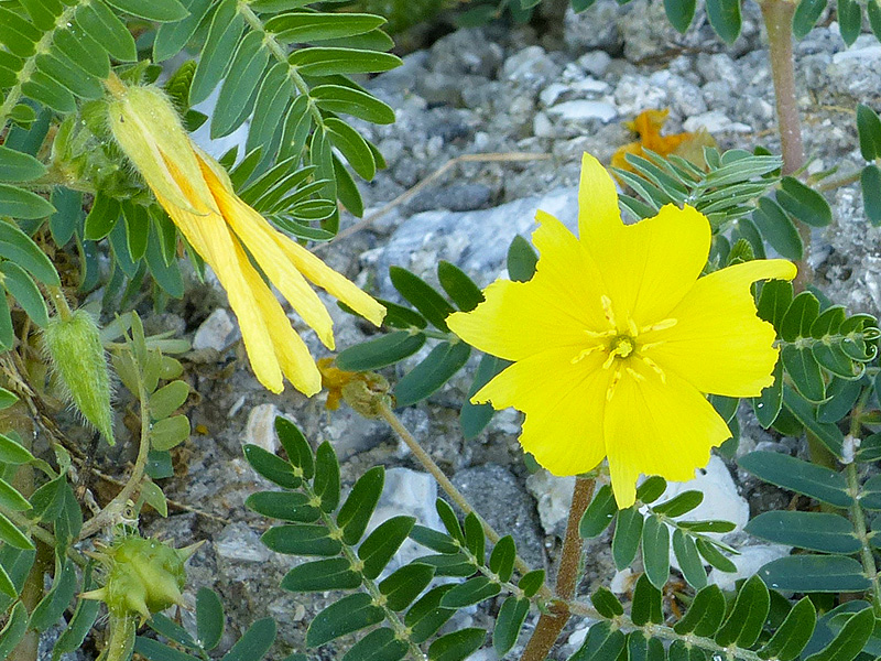 At a glance burrnut or Jamaican feverplant (Tribulus cistoides) sure is pretty, but close encounters — by barefeet or by bicycle tires — with the fruits of this plant often do not end well. Puncturevine, goat’s head, caltrop are other common names for this plant, as is buttercups (a demonstration of the lack of specificity of common plant names).