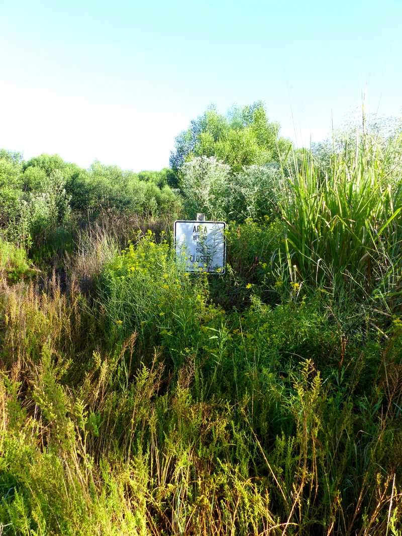 It’s a little bit early for lateflowering thoroughwort (Eupatorium serotinum) to be in flower, but this native wildflower was flowering — profusely and in multiple spots — at the Indian River Lagoon Greenway when we visited on 8/11/2018. Also known as late boneset, it is shown above along the mangrove-lined wetland crossover bridge and below in an area from which the monoculture of Australian pines was recently removed just behind a sign made somewhat superfluous by the riot of vegetation.