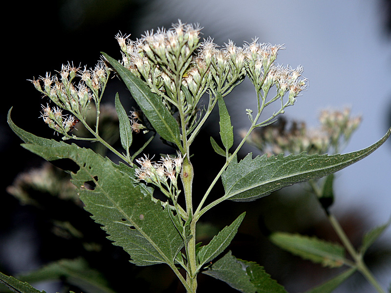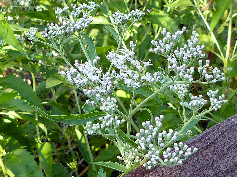 The leaves of late flowering thoroughwort, by contrast, are lance-shaped (lanceolate), long pointed, stalked, and toothed. The upper surface is smooth, and the lower surface is hairy with resinous dots. Note the two lateral veins roughly parallel to the midrib.