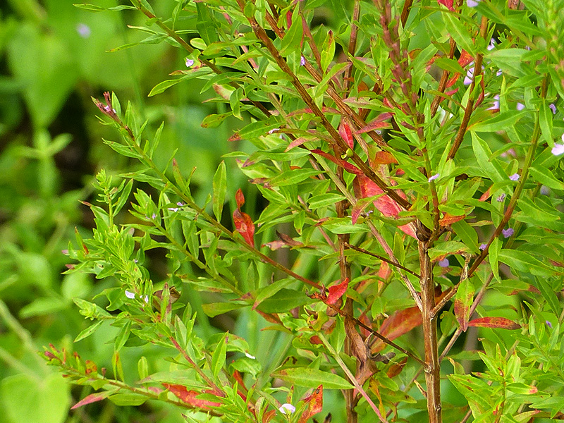 Its stems are woody and square. Older stems are ruddy, and older leaves sometimes are reddish.