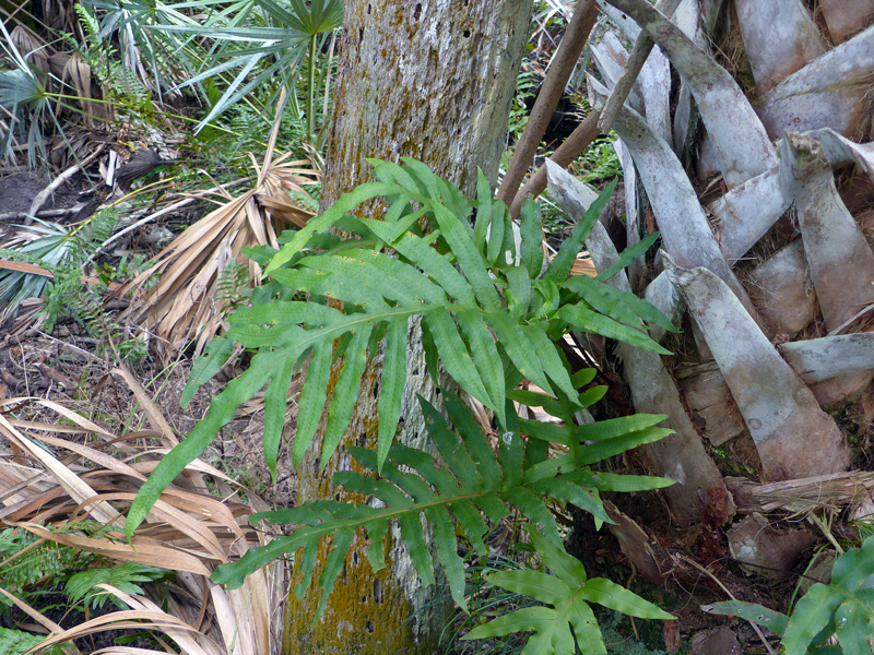 Cabbage palm, also known as golden polypody fern and serpent fern, is far more common and also grows in the “boots” of cabbage palms from a hairy dark rhizome. On occasion, this fern will be terrestrial.