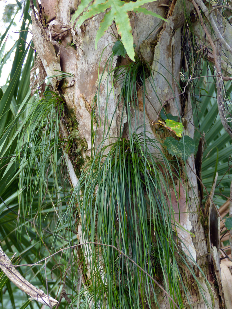 Shoestring fern is aptly named. It is a very primitive fern, not especially common, and grows only in the “boots” (old leafstems) of young cabbage palms in moist places. It does NOT transplant.