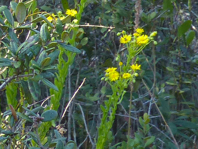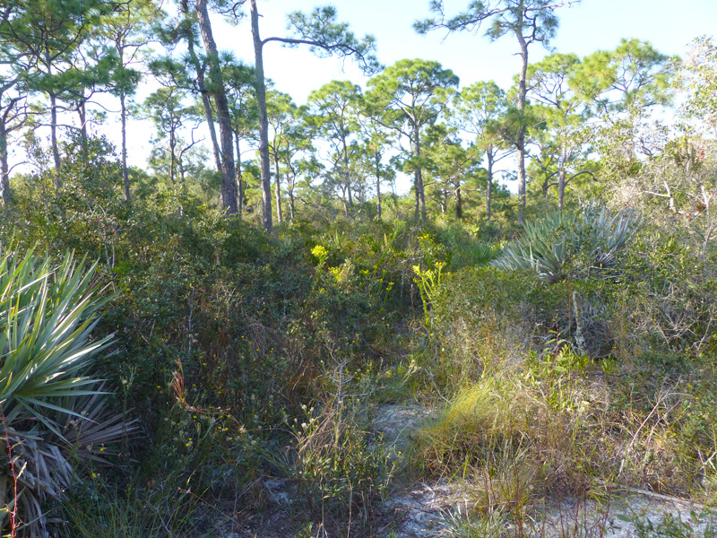 Coastalplain goldenaster (Chrysopsis scabrella) was in full flower where the main trail curves westward for a short distance but was struggling to grow through the dense cover of scrub oaks. As you would guess from its common name, this member of the daisy family, Asteraceae, has yellow flowers.