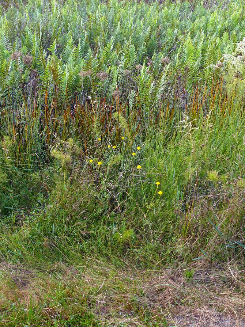 The Wabasso scrub, which we visited on 11/11/2018, is not all dry. In the midst of dry scrub pretty near the beginning of the trail was a fern-filled wetland. Since of focus was scrub and Florida scrub-jays, it was identified haphazardly in passing as blechnum fern (Telmatoblehnum serrulatum). Instead on closer inspection, it turned out to be a patch of Hottentot fern (Thelypteris interrupta).