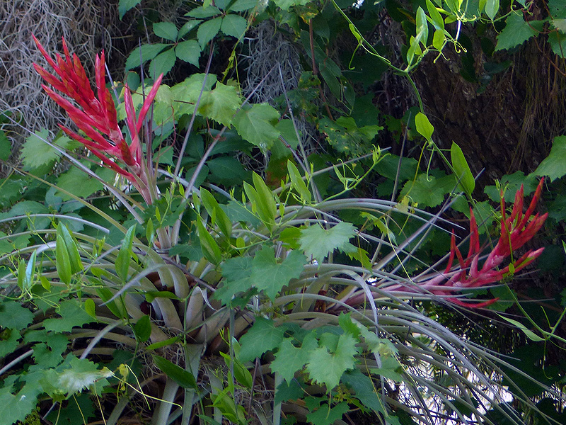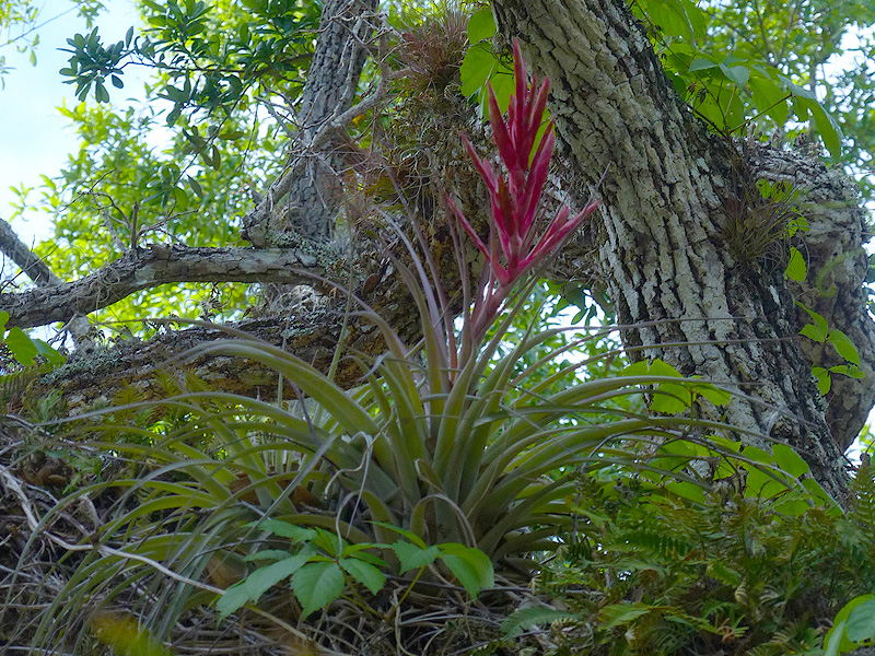 As we returned to the Florida Medical Entomology Laboratory (FMEL) parking lot after an Invasive Plant ID talk, we looked up and spied red wild pines (Tillandsia fasciculata) showing the coloration for which they are named. Cardinal wild pine is another name for this sometimes colorful epiphytic plant.