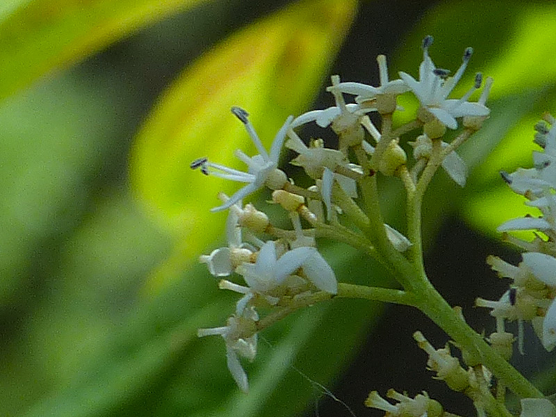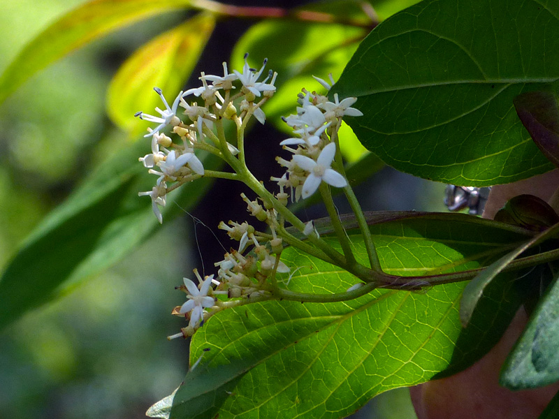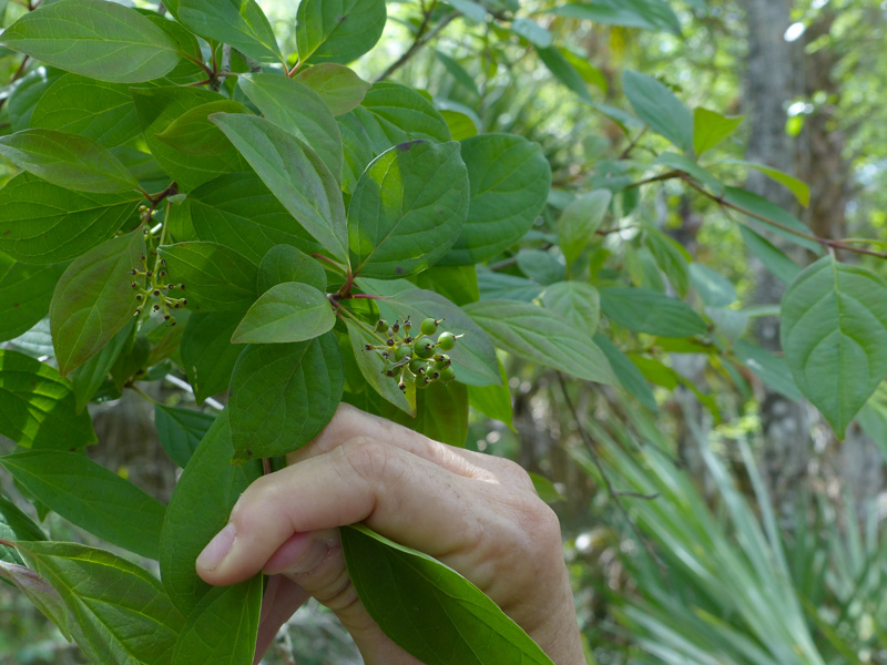 Unripe single-seeded fruits (drupes) were present, too. They will be blue-black when ripe and are consumed (and spread) by birds, raccoons, squirrels, black bears, and other mammals. White-tailed deer forage on the foliage.