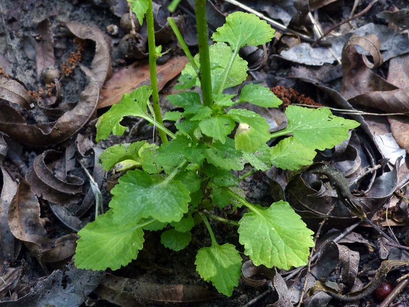 Its basal leaves are alternate and ovate with minutely scalloped margins.