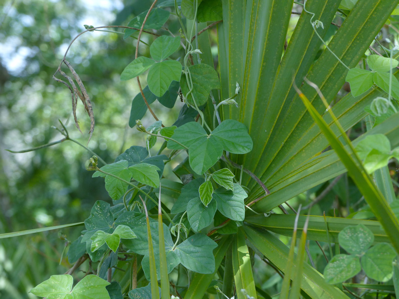 Jane Schnee (Class of 2010) identified purple bushbean (Macroptilium atropurpureum) growing up a cabbage palm at the Ansin Tract Conservation Area, before she led a walk for us there on 4/6/2019. This perennial vine with a swollen taproot can grow to be 9′ long and is native to Texas, Mexico, and parts of central American and south America.
