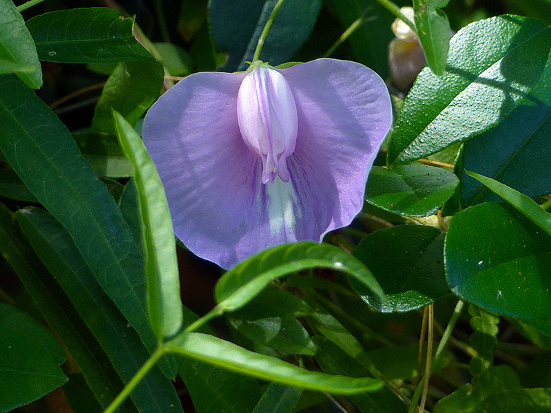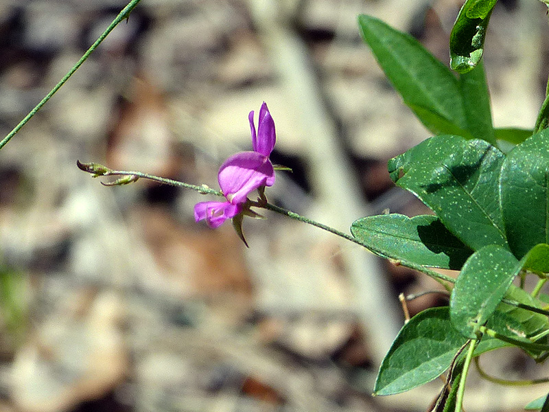 The flowers of spurred butterfly pea (Centrosema virginianum), a diminutive vine, have nickel-sized “sweet peas” type flowers and trifoliate leaves. This plant ranges from New Jersey to Florida to Texas. Peas with a temperate distribution tend to be herbaceous.