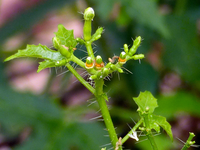 Sometimes this plant is referred to as stinging nettle or bull nettle, a common name better reserved for plants in the nettle family, Urticaceae. Tread-softly is a member of the spurge family, Euphorbiaceae, and contains a white milky sap. Spurge-nettle is yet another common name for this plant.