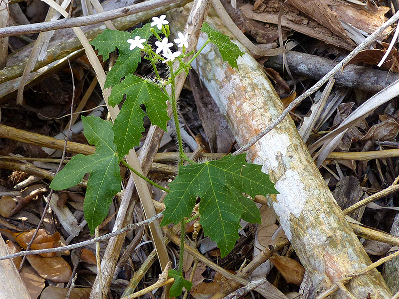 Its long-stalked alternate leaves are palmately-lobed with 3 to 5 very deep jaggedly toothed lobes. Whitish veins are evident on the dark green leaf surfaces, and the much of the surface area of the leaf is covered with venomous, stinging hairs.