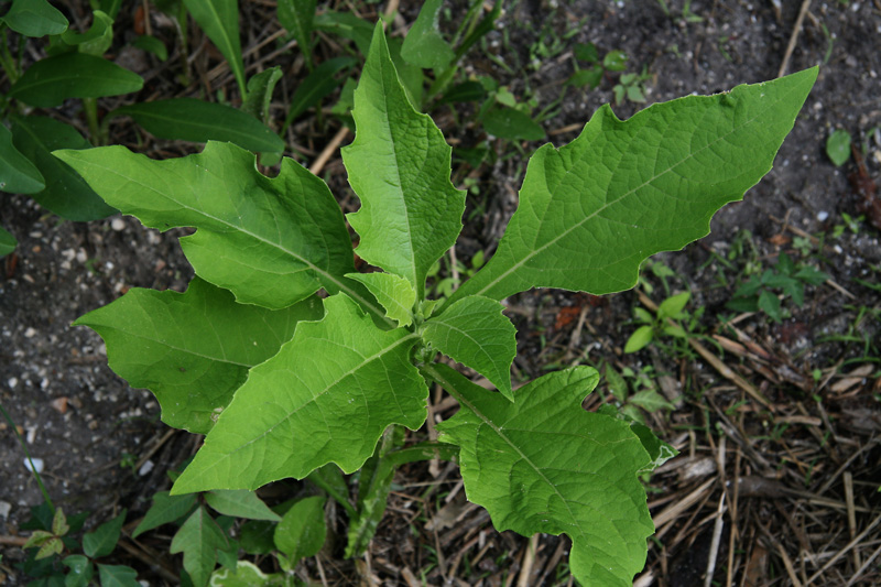White crowbeard is dramatic. Its large and variable leaves can grow to be a foot long. The opposite leaves are quite scabrous (rough to the touch) and usually have toothed margins (edges).
