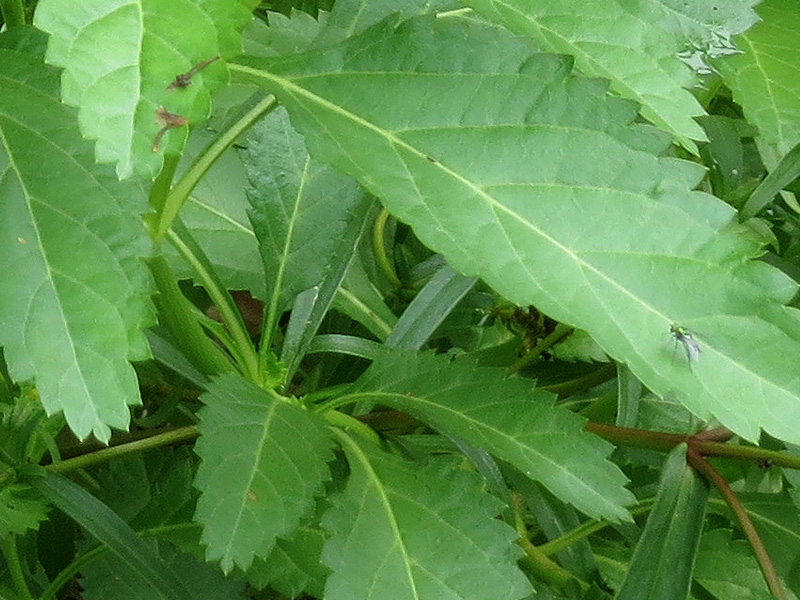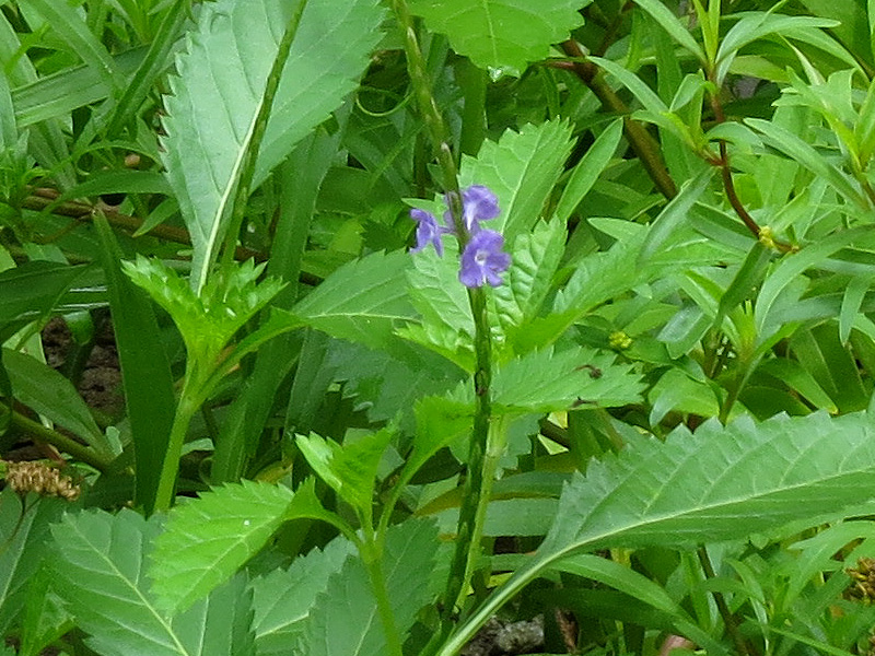 Blue porterweed is a low growing (no taller than 18″) and sprawling plant with horizontal stems. Its leaves are coarsely serrate with obtuse teeth generally pointing toward leaf tip. Its leaves are shown in the first picture. Note that there are NO prominent raised areas between leaf veins.