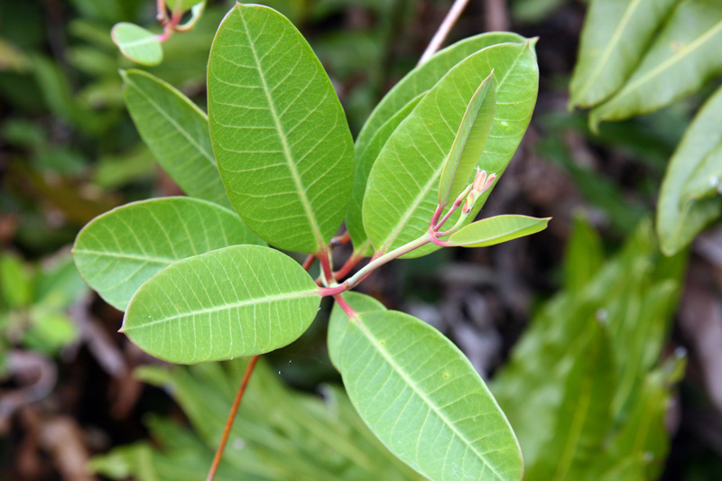 Its opposite leaves have a dramatic pinnate venation and reddish petioles (leaf stems). The leaves tend to be darker green under shadier conditions.