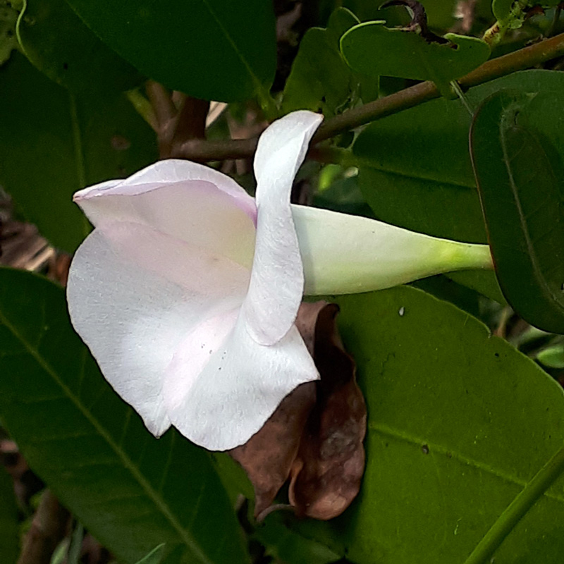 Its flowers are trumpet-shaped, as is true for many plants in the dogbane family. The deep throat is light yellow in color, and given the location of the pollen deep inside the plant, sphinx moths are thought to be the pollinators.