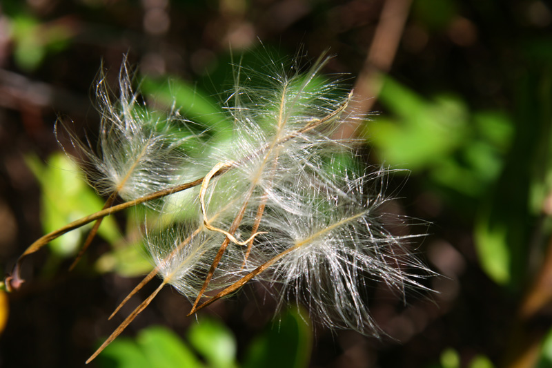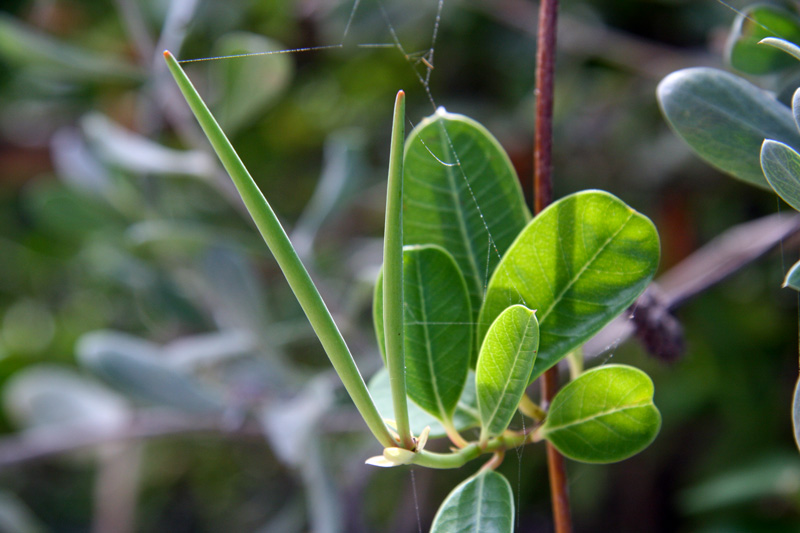 The species name, Rhabdadenia, refers to its pods, since, in Greek, rhabdos mean rod and adenos means gland. These elegant seed pods open to launch 2″ long pointy seeds festooned with fluffy silken parachutes.