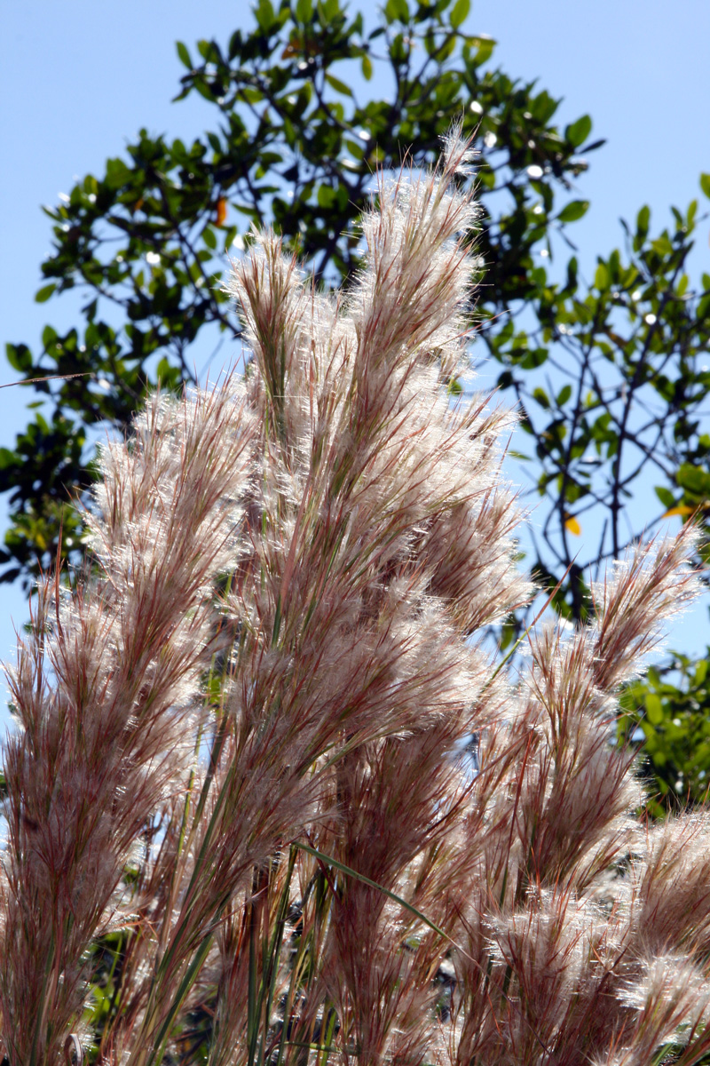 Bushy bluestem (Andropogon glomeratus) is a common native bunchgrass of moist or somewhat moist sunny places. Also known as broom sedge (a definite misnomer) and bushy beardgrass, this somewhat weedy grass often goes unnoticed until late summer when it is festooned with feathery plumes. Later in the fall, the sheaths turn a distinctive salmon-orange color.