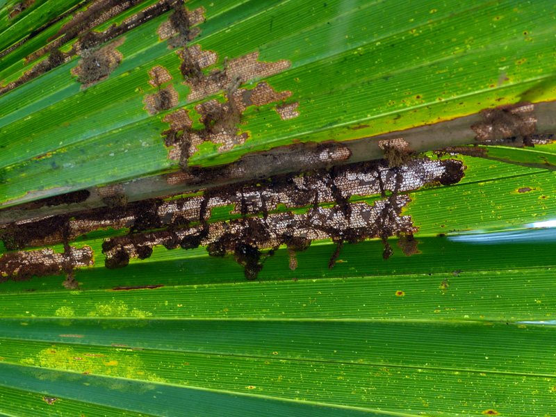Some of the fronds of cabbage palm (Sabal palmetto) at Oslo Riverfront Conservation Area (ORCA) show signs of the handiwork of the native palm leaf skeletonizer (Homaledra sabalella). This pest plagues native palms including cabbage palms and saw palmettos (Serenoa reopens , as well as palmate non-native palms like coconut palms (Cocos nucifera), Chinese fan palm (Livistona chinensis), Mexican fan palm (Washingtonia robusta), and red latan palm [Latania lontaroides].