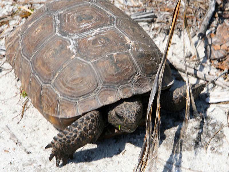 They dig deep burrows for shelter that can be up to 33 feet long in Florida’s sandy soils and which they share with more than 350 other species including the endangered Eastern indigo snake, rodents, gopher frog, Florida mouse, and hundreds of invertebrates. Because so many other critters rely on their burrows, they are termed a keystone species.