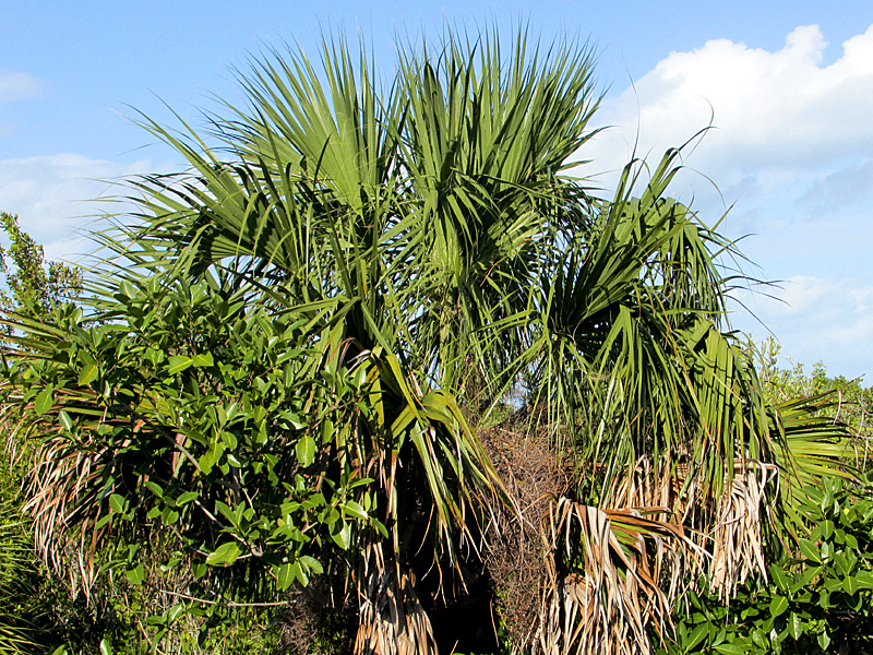 Strangler fig trees often, but not always, begin their life in the boots (old leafstems) of cabbage palms (Sabal palmetto). They do not literally strangle their host, but they send down substantial aerial roots and out-compete their host for nutrients, water, and sunlight.
