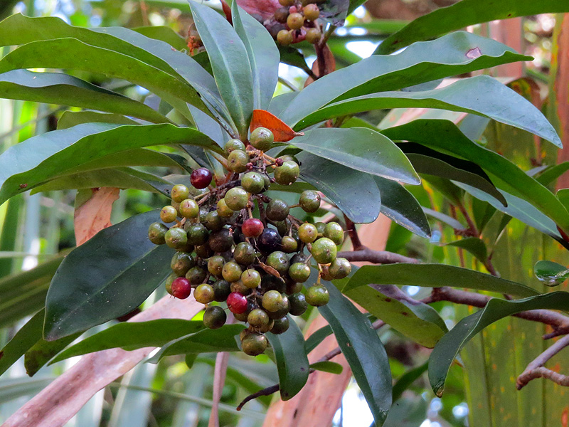 Mature leaves are dark green, glossy, elliptic, and about 3 – 5″ long. New leaves are pale with a purplish-brown midvein. The purplish terminal stems differentiate this plant from its native cousin, myrsine (Myrsine cubana), and its invasive exotic kin, shoebutton ardisia (Ardisia elliptica) and coralberry (Ardisia crenate). All of these related plants belong to the myrsine family, Myrsinaceae.