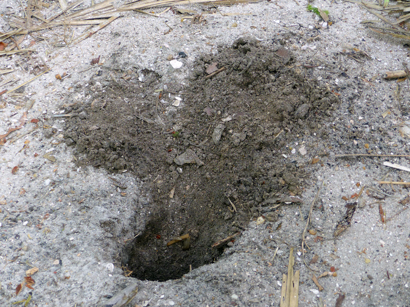 Blue land crabs are quite fastidious, routinely “cleaning” their burrows. Each morning this large burrow obviously has been “cleaned” …