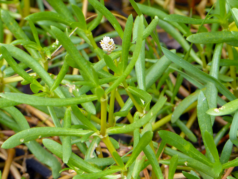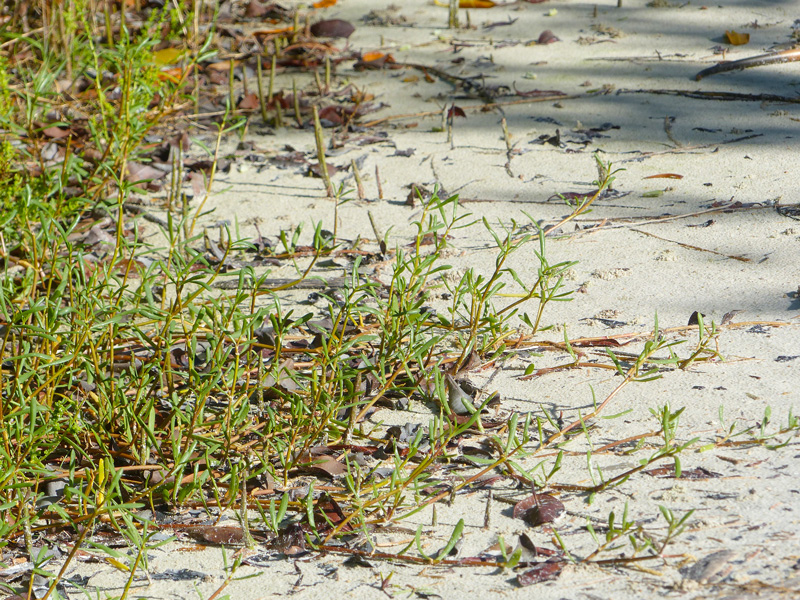Its flowers are the easiest way to differentiate this plant from shoreline purslane. Slightly silvery heads emerge from the leaf axils (angles) and house tiny yellow 5-petaled flowers that attract small pollinators. Flowering occurs throughout the year peaking in the spring.
