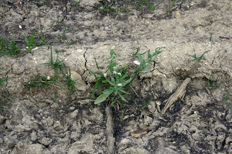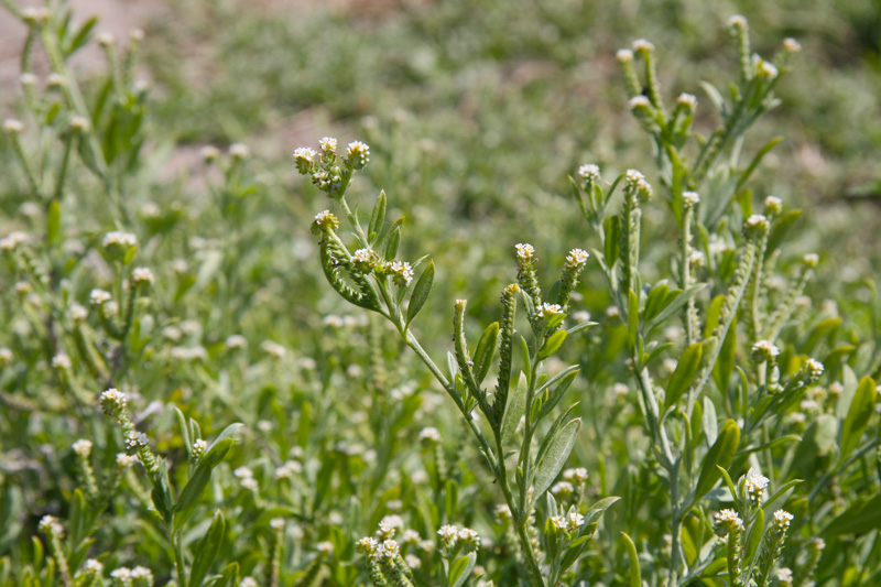 Seaside heliotrope (Helitropium curassavicum), a.k.a. salt heliotrope, is a halophyte (plant of salty spaces) in Florida, but this wide-ranging plant inhabits moist places throughout the U.S. to central Canada to Argentina. It sometimes can be invasive in Africa, Asia, Australia, and Europe in disturbed spots.