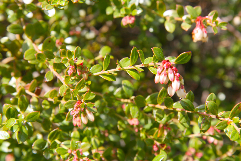 This low growing evergreen shrub with small alternate leaves flowers, often profusely, in the spring, and its whitish-pink urceolate (urn-shaped) flowers attract a variety of pollinators.