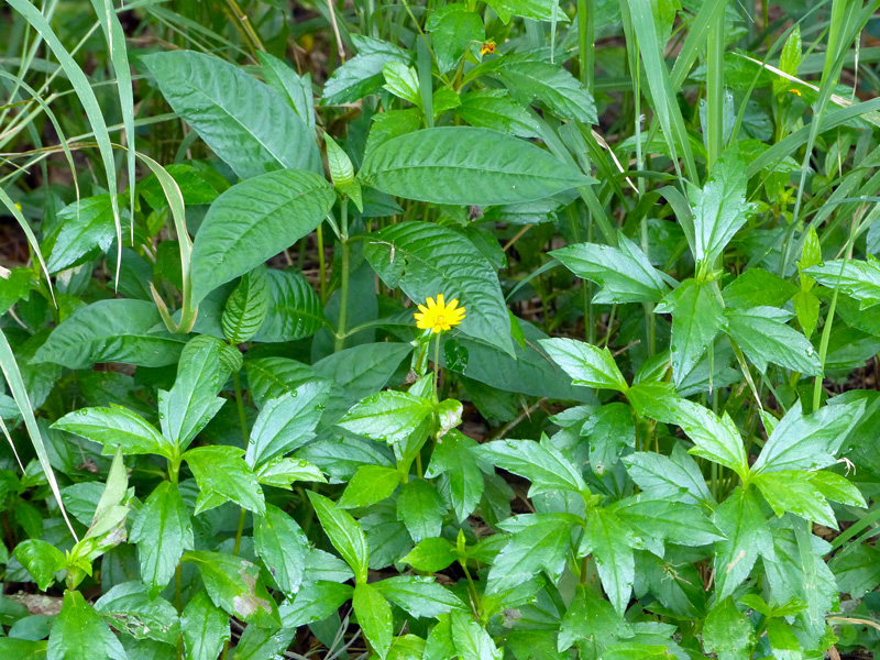 Also known as wedelia, this aggressive groundcover has sunny daisy flowers and once was recommended for xeriscaping by the water management districts. In this picture it is trying to overwhelm shortleaf wild coffee (Psychotria tenuifoliaa). Even a tiny piece will root. You will find lots of it growing along Oslo Road near the Florida Medical Entomology Laboratory and into the ditch.