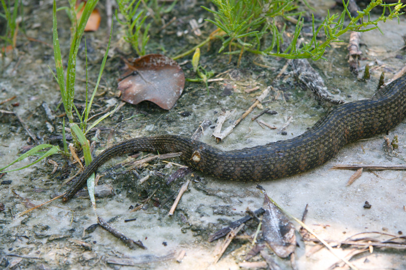 On a group walk to the Observation Tower at the Oslo Riverfront Conservation Area (ORCA) on 8-14-2009, we encountered this husky Florida water snake (Nerodia fasciata pictiventris). These semi-aquatic snakes are found throughout the southeast. They are NOT poisonous but, when threatened, will bite and will release a stinky musk.