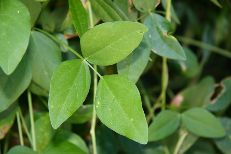 Its leaflets are held in groups of three. Young stems are green and soft, and older stems thicken and become more fibrous.
