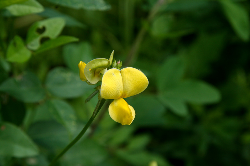 Hairy cowpea (Vigna luteola) is a twining vine with bright yellow flowers that are held on long flower stalks (pedicels). This member of the pea family, Fabacae, can smother other vegetation, especially when ample water and nutrients are available. At Pelican Island National Wildlife Refuge, this perennial vine grows abundantly over the un-mowed vegetation that lines its man-made ponds.