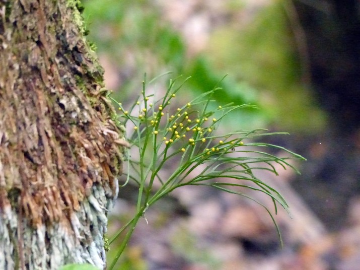 Whisk ferns attach to to a tree trunk or the ground via hair-like projections called rhizoids and initially are “fed” by symbiotic mycorrhizal fungi. When the “baby” whisk fern (gametophyte) begins to perform photosynthesis, the co-worker fungi finally begin to reap their rewards.