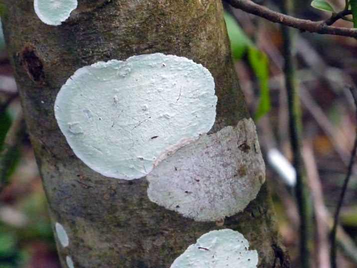 At a quick glance it looks like a white paint ball blotch, but it is not. With its white brightness, wreath lichen (Cryptothecia striata) stands out on the trunks of lancewood (Nectandra coriacea) on the east-west trail that leads away from hammock loop trail at the Oslo Riverfront Conservation Area (ORCA).