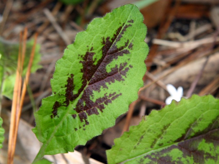 Its leaves are shaped like a lyre and give rise to the species name lyrata. Some, but not all, leaves are marked with maroon along the midrib (central leaf vein).