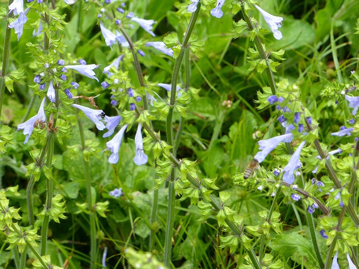 Its flower stalks can be up 2′ tall. Flowering progresses from the bottom of the stalk to the top. Flowers are purplish or bluish and the longer bottom lobe provides an inviting landing platform for pollinators.